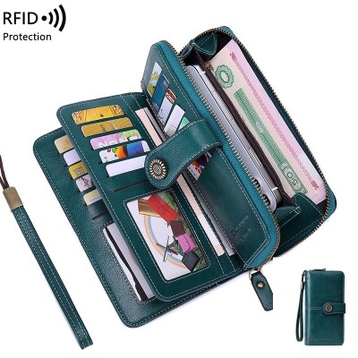 RFID防磁錢包女 新款歐美女士錢包油蠟皮錢夾皮夾大容量手拿包 大容量長夾 多卡位長夾 皮夾