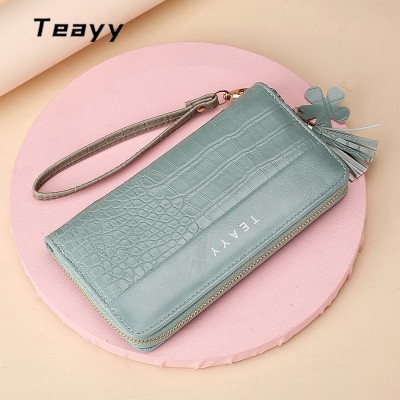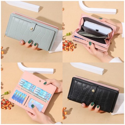新款長款女士錢包鱷魚紋多卡位PU皮素色簡約大容量零錢包卡包 大容量長夾